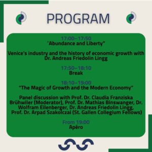The evening begins with a lecture by Dr. Andreas Lingg on economic growth in the Republic of Venice, followed by a panel discussion with Collegium Fellows and scholars, moderated by Prof. Claudia Brühwiler. The event concludes with an Apéro.